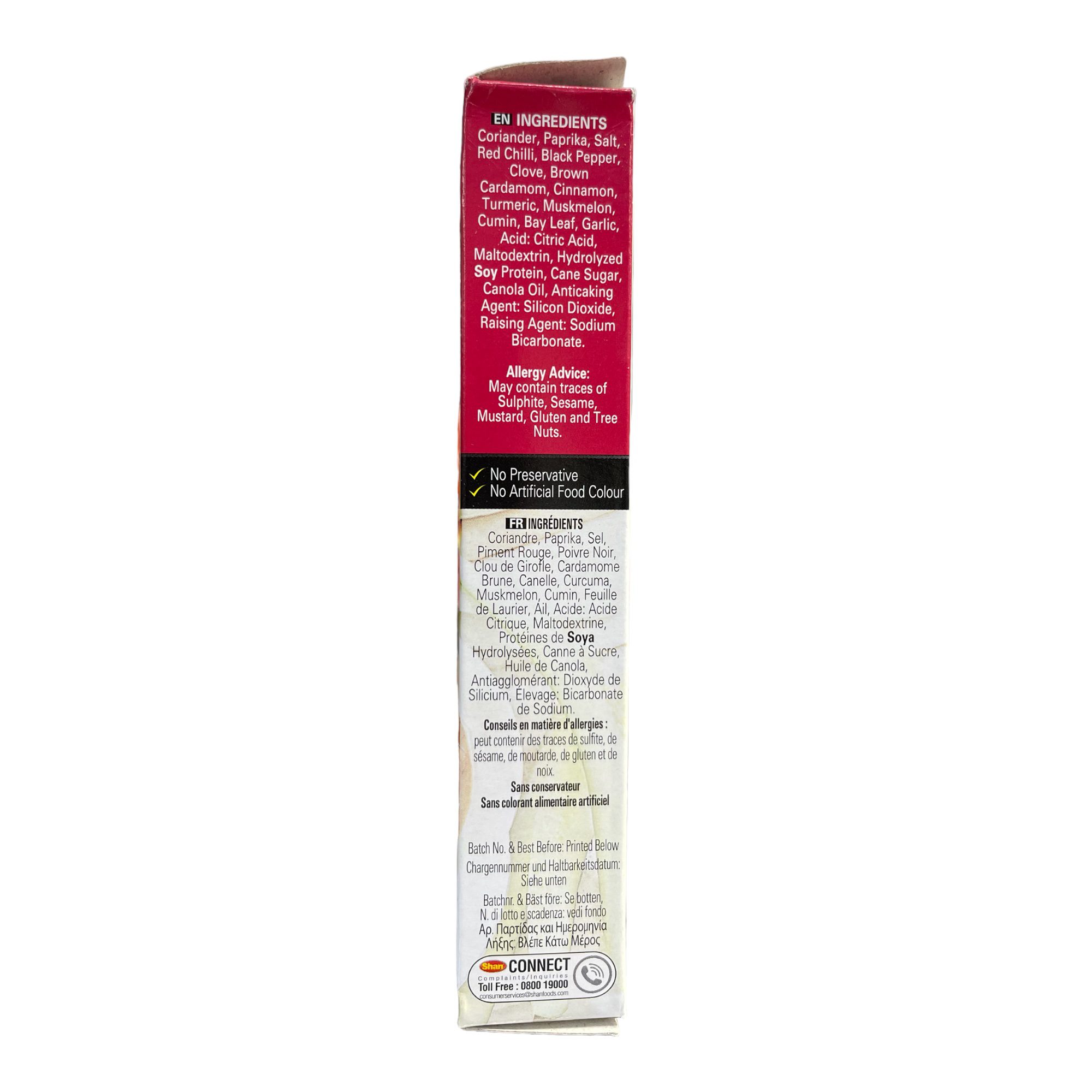 | Ingredients | Coriander, paprika, salt, red chilli, black pepper, clove, brown cardamom, cinnamon, turmeric, musk melon, cumin, bay leaves, garlic, acid: citric acid, maltodextrin, hydrolyzed soy protein, cane sugar, canola oil, silica. |