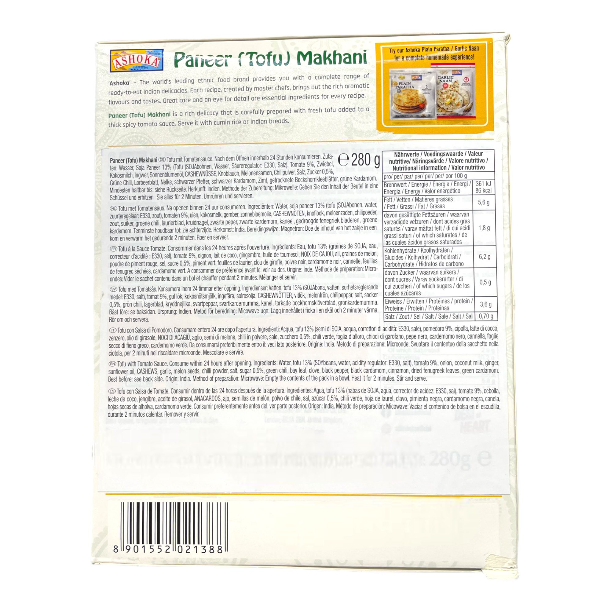 | Ingredients | Tomato (38%), Indian Cottage Cheese (24%), Onion (10%), Clarifiedbutter (7%), Water, Milkcream (2%), Chilli, Cashew Nuts, Curd, Salt, Curry Powder, Ginger, Black pepper powder, Ajowan, Cumin and Bay leaf. |